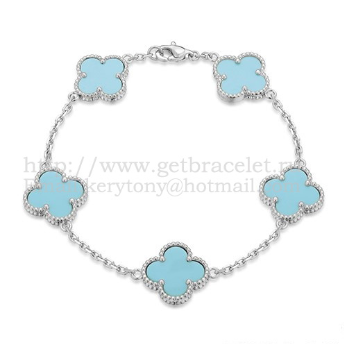 Гривна Van Cleef Arpels Alhambra с 5 мотива, бяло злато с тюркоаз и седеф