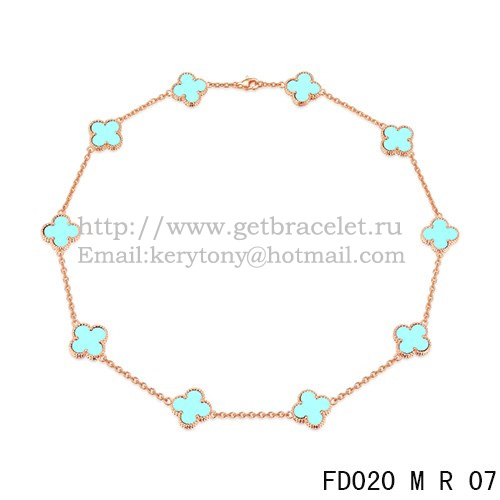 Колие Van Cleef Arpels Alhambra от розово злато, 10 мотива, тюркоаз, седеф, 45 см